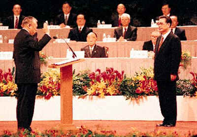 董建華在國務院委員面前宣誓就職為香港特區行政長官,國務院總理李鵬負責監誓。