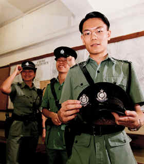 A police officer fits a new cap badge designed for the Hong Kong Special Administrative Region police force. An old badge is in his right hand.