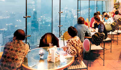 A restaurant's window seat allows diners to enjoy one of the world's great vistas - the Hong Kong city skyline.