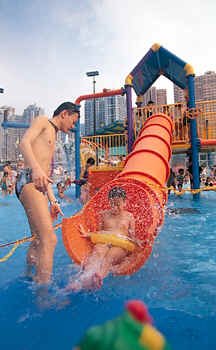 Children cool off from summer heat in a swimming pool at a housing estate at Ma On Shan.
