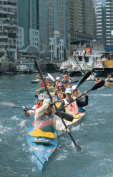 Competitors form a splashing line as they dig in with their paddles during the Hong Kong Open Marathon Canoeing Championship.