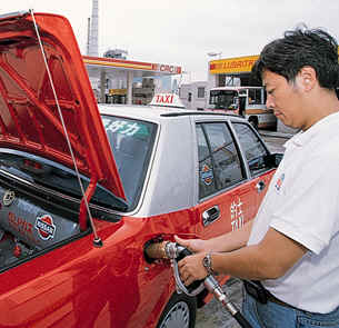 A taxi driver shows off the tank installed in the boot of his vehicle to hold liquefied petroleum gas (LPG). The government is studying the merits of using LPG more widely in its efforts to control air pollution.