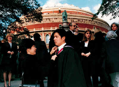 皇家阿尔贝特礼堂门外,一名无比自豪的香港母亲,正替参加伦敦大学帝国学院毕业典礼的儿子整理毕业礼服。