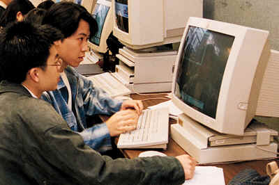 温哥华卑诗大学里,香港学生利用电脑学习。
