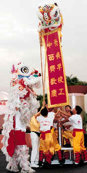 月二十七日青屿干线开幕典礼上,节目丰富多彩,例如图中的舞狮表演。