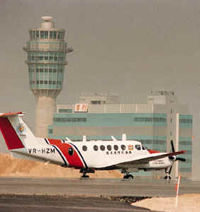 架政府飞行服务队空中霸王B-200C飞机于四月三十日作象征式飞行后,是首架降落在赤鱲角机场跑道的飞机。