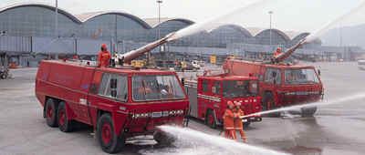 防员在赤鱲角新香港国际机场用水炮和消防喉进行演习。