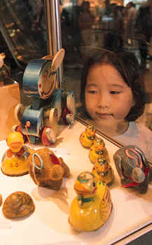 铜锣湾世界贸易中心举办的"童年时"怀旧玩具展上,一名女孩正细意欣赏玩具展品。