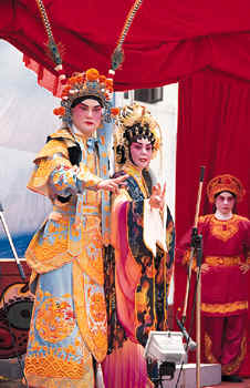 粤剧生旦的浓妆艳抹和璀灿夺目的服饰背后,荟萃了中国数千年的文化传统。图中是粉岭龙跃头在三月举行的龙跃头文物日暨围村修复开幕典礼公演神功戏一景。