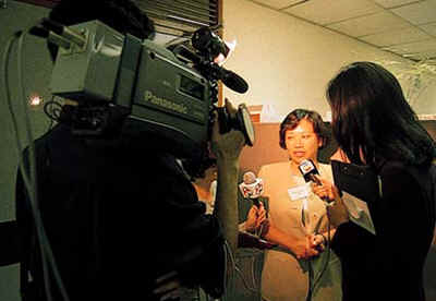 务员在一项模拟电视台记者突击访问的训练课程中,学习如何应付传媒。