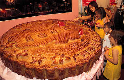 香港会议展览中心举行的美食博览上,参观者正在欣赏展出的巨型月饼。