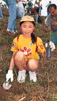 位蹲在地上的女孩,正义务参与在大帽山山腰川龙举行的植树日活动。