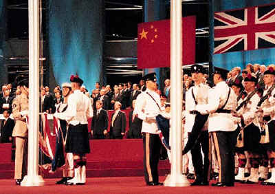 交接仪式中,在场人员收起英国和香港的旗帜。