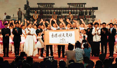 家主席江泽民(中)将其亲笔题字"香港明天更好"赠予行政长官董建华。