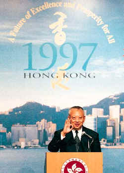 港在七月一日成为中华人民共和国特别行政区,迈进一个新纪元。当日举行了各式各样的活动,图中行政长官董建华正举行记者招待会。