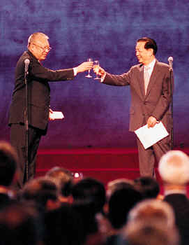 政长官董建华与国务院副总理兼外交部长钱其琛祝酒。