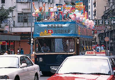 局利用巴士作宣传,呼吁市民在香港特别行政区首届立法会选举中登记为选民。