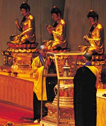 僧侣供奉才第三度离京展出的佛牙圣物。小金塔内安放的灵牙舍利,是二千五百多年前佛祖释迦牟尼火化后前人从骨灰中取出的圣物。佛牙于五月在香港体育馆展出,庆祝五月二十二日佛诞日首次成为香港的公众假期。