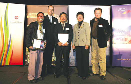 香 港 导 演 陈 果 ( 最 左 ) 、 香 港 驻 悉 尼 经 济 贸 易 办 事 处 处 长 华 陈 真 妮 ( 右 起 第 二 位 ) 和 其 他 知 名 人 士 , 出 席 二 零 零 五 年 墨 尔 本 国 际 电 影 节 的 “ 香 港 电 影 选 映 ” 揭 幕 酒 会 。