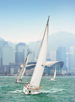 Hong Kong offers a wide variety of sports for participants and spectators. Here, yachts competing in April in the Rolex China Sea Race 2012 from Hong Kong to the Philippines pass the Hong Kong Convention and Exhibition Centre.